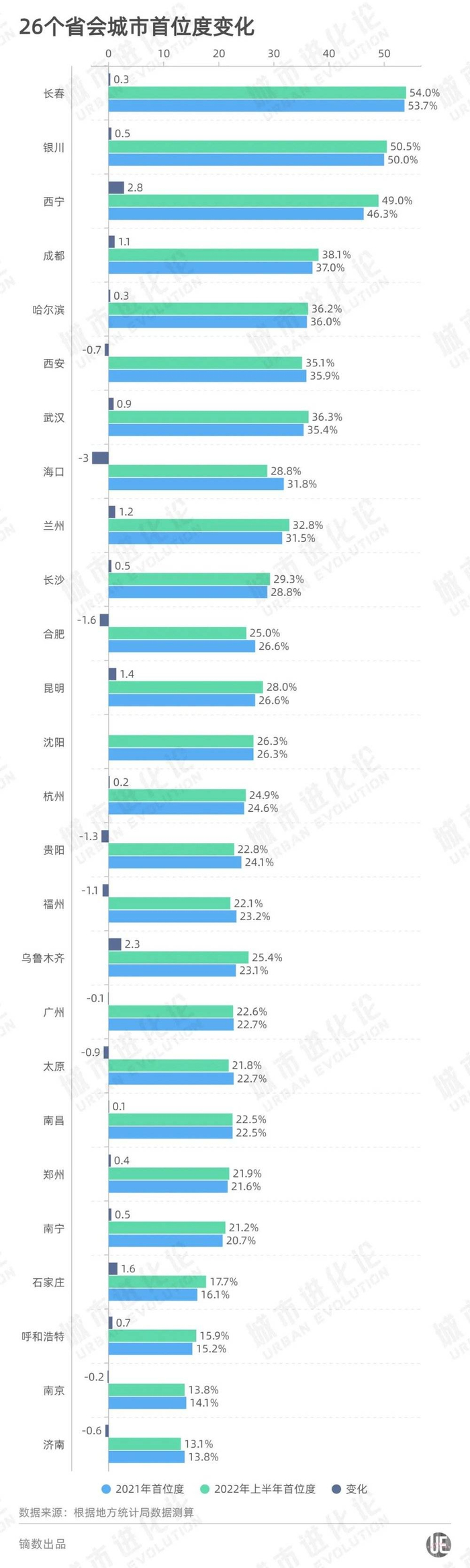其中,经济负增长的长春首位度(54%)不降反增,依然为全国最高,这主要是因为吉林受疫情影响,全省上半年经济总量出现负增长,基数减少导致比重有所上升。