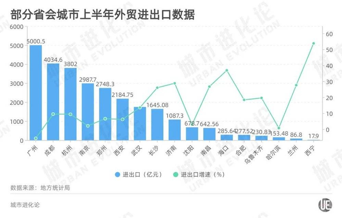 从已公布数据来看,上半年至少有10个省会城市进出口总额实现两位数增长。其中,西宁(53.8%)、海口(36.9%)、济南(28.8%)、兰州(27.6%)、南昌(26.7%)、长沙(26%)增速领先。