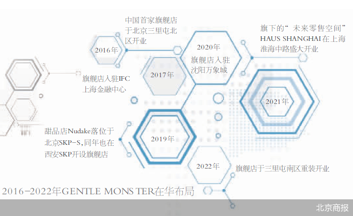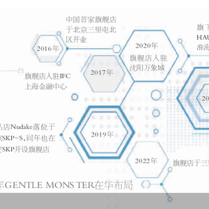 根据官网数据,自2016年5月进入中国以来,GENTLE MONSTER已经在内地开出了17家门店。据悉,从2011年开始,GENTLE MONSTER已经在全世界布局超过60家门店,商业版图也不局限于墨镜,还拥有自创甜品品牌Nudake及香氛品牌Tamburins。