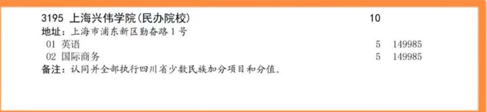另据封面新闻,上海兴伟学院2022年计划在四川招生30人,文科10人,理科20人,均为国际商务和英语专业。招生批次为本二批次。从8月4日四川省教育考试院公布的本二批院校征集志愿名单中,该校文、理科均在征集志愿名单中,征集计划文科10人、理科20人,相当于经过一轮投档后,学校还没有招到一名四川学生。