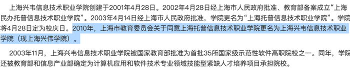每经小编在上海教委官网及其学校官网检索发现:上海兴伟学院前身是上海托普信息技术职业学院(筹)创建。2010年,上海市教育委员会关于同意上海托普信息技术职业学院更名为“上海兴韦信息技术职业学院”。2014年2月经上海市政府批准,在原上海兴韦信息技术职业学院的基础上组建。2014年4月,学院升格更名为本科层次的“上海兴伟学院”。