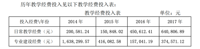上海市教委官网公布的上海兴伟学院最新教学经费(日常教育学经费、专业建设经费)投入表显示,2014年36.38万(20万、16.38万)、2015年56.6万元(15万、41.6万),2016年60.7万元(45万、15.7万),2017年101.4万元(64万、37.4万),这项数据在2020-2021年的教学质量报告中有变动60.72万(56.72万元、4万)),2018年125.2万元(43万、82.2万),2019年133.4万元(41.6万、91.8万),2020年349.6万(298.3万、51.3万),7年来,学校教学经费投入合计863.28万元,平均每年123.32万元。