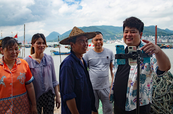 6月30日,福建省福安市下岐村,95后村民江建斌(右一)在大学期间就开始做直播,毕业后他放弃在厦门的工作回下岐村创业,帮助渔民直播卖货创收。