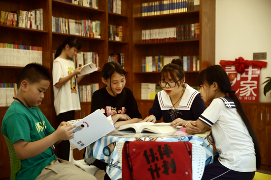 6月30日,下岐村新时代文明实践展馆,大学生志愿者张梦倩在阅读室给村里的孩子普及安全知识。船民家庭的孩子上岸后,当地扩建了学校,让适龄儿童都有学上。