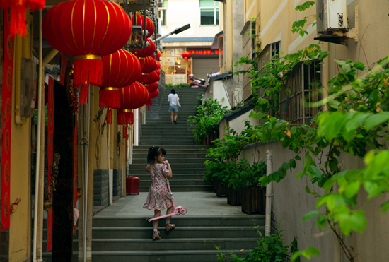 6月29日,福建省福安市下岐村,孩子走过一条小巷。船民安置点实现水、电、路、电视、电话“五通”,配备了卫生医疗站、学校等设施,船民的医疗、教育有了保障。
