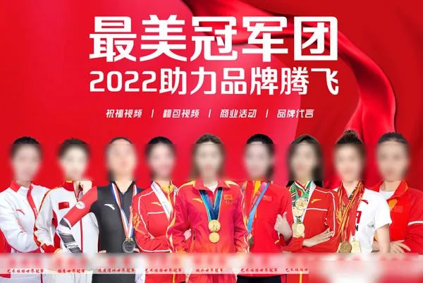 近来,网络上流传着各种“最美冠军团”的“打包代言”图片。比如,7月7日,一位认证为“明星经纪人”及某文化发展有限公司执行董事的微博用户发布了一则“最美冠军团2022助力品牌腾飞”的宣传图,图片中出现了五位“艺术体操世界冠军”。