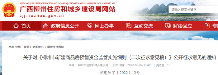 为进一步加强我市新建商品房预售资金监管,促进我市房地产市场健康发展,我局拟对《柳州市商品房预售资金监管使用办法》(柳建规〔2019〕5号)进行修订。在前期征求各方面意见的基础上,我局对征求意见稿进行了修改完善。为充分听取公众意见和建议,现将《柳州市新建商品房预售资金监管实施细则(二次征求意见稿)》予以公布,再次公开征求社会各界意见。如有意见和建议,请于2022年8月17日前将意见建议以电子邮件形式反馈至柳州市住房和城乡建设局。