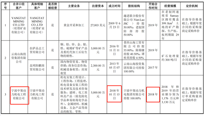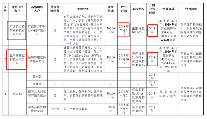 这些客户中,宁波中策动力机电工程有限公司、广西伊万特矿业科技有限公司和昆明赛铭克科技有限公司均属于其大客户。据天眼查查询,昆明赛铭克科技有限公司的参保人数和实缴资本均为0,昆明赛铭克科技有限公司的营业收入90%以上来自于森合高科,似乎是为了森合高科而设立。据森合高科表示,这些公司原先是以非法人实体的形式从事相关业务,并且具有一定的客户资源,为了满足经营需要,设立了法人主体进行运作。