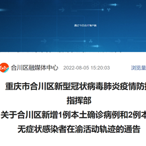2022年8月5日,重庆市通报合川区新增1例本土确诊病例3(轻型)和2例本土无症状感染者(6、7),均系8月3日无症状感染者1的密切接触者。
