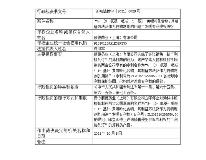 医药健康地方台梳理发现,本次裁决已非利格列汀引发的第一起维权案件,2021年10月8日,勃林格殷格翰诉颐德药业(上海)有限公司专利侵权成功,颐德药业被上海知识产权局责令停止许诺销售利格列汀。