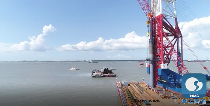 上午,记者在张皋汽渡上游数百米处的施工现场看到,国内第二大打桩工程船“雄盛桩17”正“抱住”一根长约31米、重约38吨的钢护筒缓慢移动,将这根“定海神针”沉放到指定位置后,再打入江底。目前像这样的钢护筒已经打设到第7根。