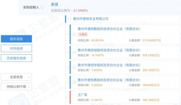 德赛集团目前由德恒实业100%持股,德恒实业由5间德字系股权投资合伙企业和一名叫王广军的自然人股东构成。