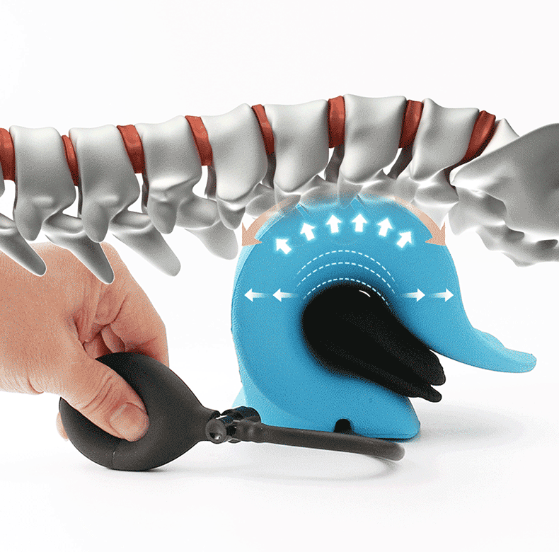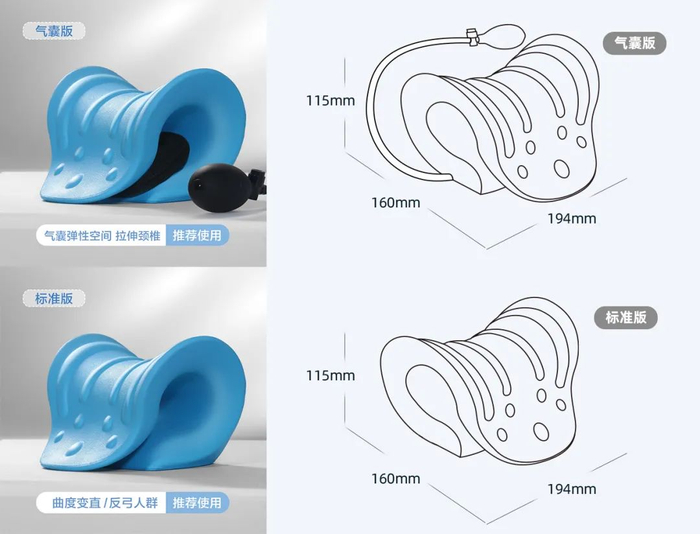 比起曲度单一无法调整高度的传统矫正枕,NOXELES颈椎枕气囊款还加入了立体气囊的设计,通过充气放气,可以不断调整曲度,以满足不同的拉伸力度需求。