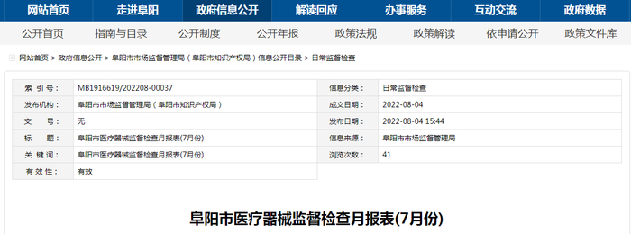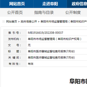 中国质量新闻网讯 近日,安徽省阜阳市市场监督管理局发布医疗器械监督检查月报表(7月份)。
