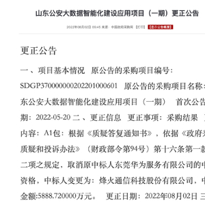 同时,中标人变更为烽火通信科技股份有限公司,中标金额为5888.72万元,更正日期为2022年8月2日。山东省政府采购中心公告称,根据《质疑答复通知书》,依据《政府采购质疑和投诉办法》第十六条第一款第二项规定,取消原中标人东莞华为中标资格。