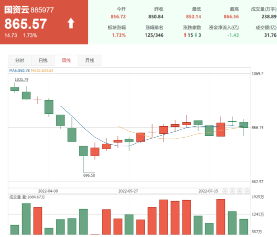 市场对国资云也比较关注,同花顺国资云概念板块最近反弹幅度较大,但波动也不小,从4月末696.50点,涨至8月4日收盘最新的865.57点。