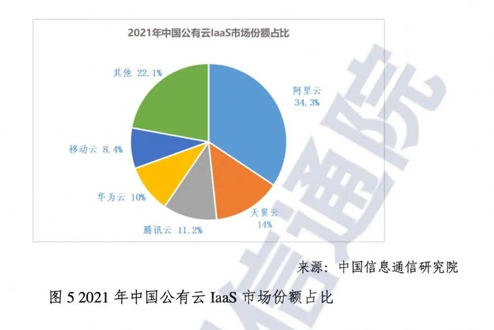 2021年我国公有云市场当中,IaaS市场规模为1614.7亿元,增速80.4%,占总体规模比例接近四分之三;阿里云、天翼云、腾讯云、华为云、移动云位居前五。显然,当下的云服务市场主要是以私企经营为主。