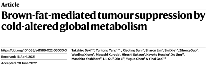 2022年8月3日,瑞典卡罗林斯卡医学院Yihai Cao院士课题组与复旦大学、山东大学、温州医科大学等高校的科研人员合作,在《自然》杂志上发表了题为Brown-fat-mediated tumour suppression by cold-altered global metabolism的研究成果,提出了寒冷通过激活棕色脂肪抑制肿瘤生长的全新理念,并给出了相应的治疗思路。