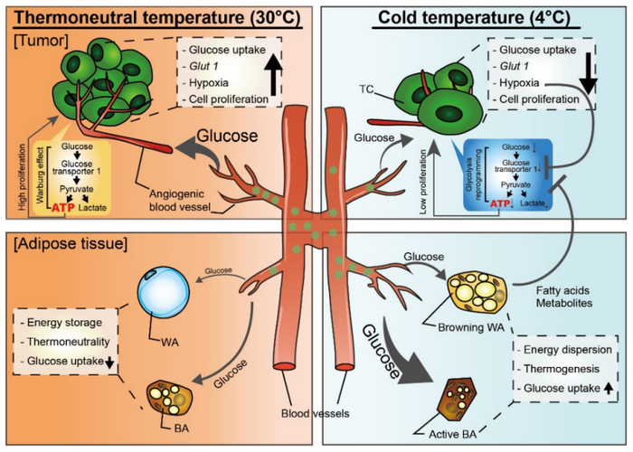 Despite multiple therapies available (most of which incur significant side-effects), cancer remains one of the leading causes of death worldwide. In a new study published in Nature, Cao and colleagues report that cold-activated BAT outcompetes tumors for glucose to restrict tumor growth, suggesting cold exposure as a new approach in cancer therapy. (癌症是世界主要死亡原因之一,尽管已有多种治疗手段,但大多数会产生明显的副作用。在《自然》杂志上发表的一项新研究中,Cao及合作者报告,冷暴露激活的棕色脂肪能与肿瘤竞争葡萄糖,从而限制肿瘤生长,提示寒冷干预是癌症治疗的一种新方法。)