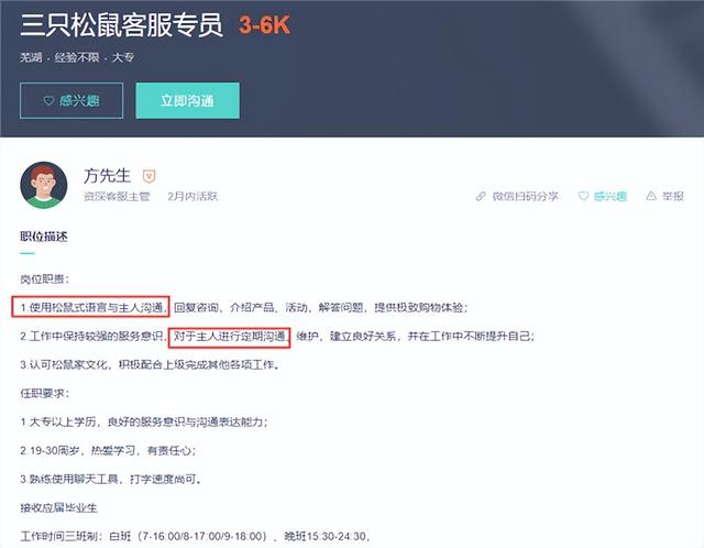 经过搜索,三只松鼠部分门店在招聘客服专员时,第一条职责就写道:“使用松鼠式语言与主人沟通”。