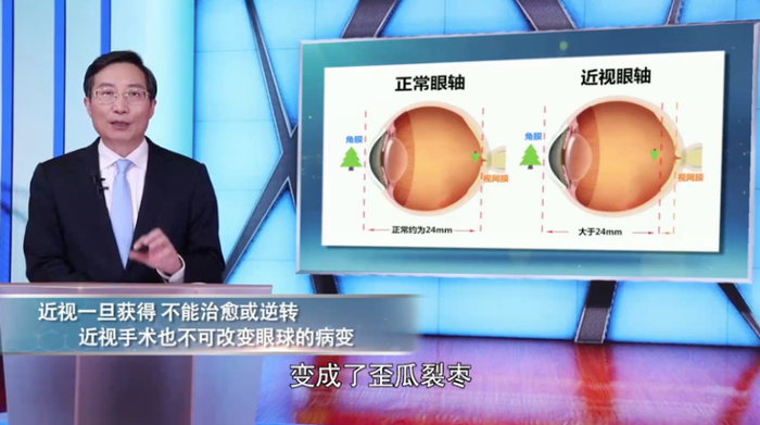 很多人疑问,近视手术不是可以治愈近视吗?2021年,北京同仁医院副院长、眼科主任魏文斌在《国家开放大学·名师好课》节目中表示,“目前为止,还没有一种药物或者一种手术能把近视治好。近视的手术,仅仅是为了给大家摘眼镜,但是近视的状态是永远没有变化的。尤其是高度近视、超高度近视,引起我们眼球的变化。”⑥