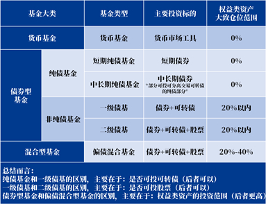 • 非纯债基金:相对的,可部分投资于转债或股票类资产,按照权益类资产的具体类别和占比,再分为一级债基、二级债基。
