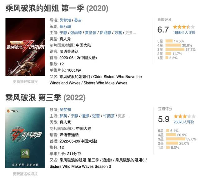 更直接的数据佐证是,在豆瓣上,即便不谈评分,只看打分人数,《乘风破浪的姐姐3》热度也下滑明显。截至上游新闻记者发稿时,《乘风破浪的姐姐1》的打分人数超过了16万,而正在播出的第三季下降为了只有2万多人,不足前者的1/8。