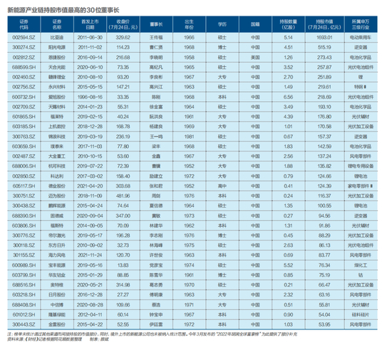 《财经》记者根据同花顺iFind数据统计,按照上市公司董事长直接持股市值计算,截至今年7月24日,持股市值超过百亿的新能源产业链董事长将近20位。而在整个A股市场上,同期持股市值超百亿的董事长为57位。这意味着,按照直接持股市值统计,A股市场身家超百亿的董事长有三分之一出自新能源产业链。