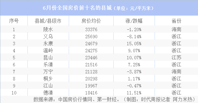 从增速来看,前十名的多个县城房价也延续大涨态势。其中,永康房价涨幅最高,同比上涨15.05%,均价达24679元/平方米。而义乌跌幅最大,同比下跌8.14%,6月房价为25690元/平方米。