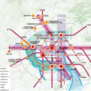 •提升广州南站商务区、白鹅潭中心商务区、长隆万博、佛山新城等都市圈(城市)级中心辐射能级和国际化影响力,加快南沙、顺德、佛山西站枢纽、广州国际空铁枢纽、珠三角枢纽(广州新)机场、中新知识城、肇庆东站枢纽等外围综合型中心建设,依托轨道站点、产业平台培育多个专业中心。