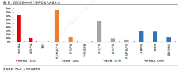 观察者网注意到,卤味制品企业在收入结构上都较为单一,如绝味、周黑鸭、煌上煌的第一大产品收入贡献均超过50%,号称“中华老字号”的德州扒鸡也不例外。