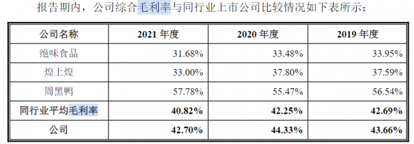 不过从整体毛利率来看,德州扒鸡高于不少卤食企业,其2021年整体毛利率达42.70%,较绝味食品、煌上煌分别高出9.14个百分点、7.82个百分点。