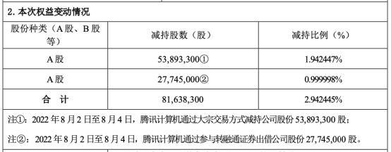 公告显示,8月2日至4日,腾讯通过大宗交易减持华谊兄弟股票5389万股,占公司总股本的1.94%,减持均价为2.2元/股。另外,腾讯通过参与转融通证券出借2774.5万股,导致持有的公司股份比例减少约1%。