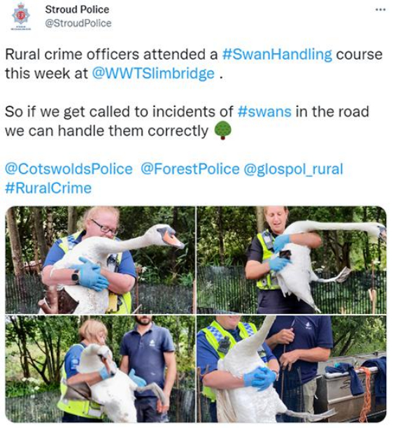 近日,某英国警察局称,警员们刚刚完成了“天鹅控制”相关课程的培训。简而言之,就是学习怎么在既不伤到自己(尽量)又不伤到天鹅的情况下,处理好捣乱的天鹅。