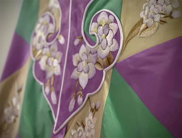 在后台,十几套色彩雅致、纹样别致的戏服刚刚送到,分别是手工苏绣和机绣相辅相成制作而成。赖宣吾一边展开一边介绍,此次服装他在纹样颜色上下了很大功夫,尤其是戏服上的很多花鸟图案,并不同于传统昆剧戏服,但却都从画谱而来。