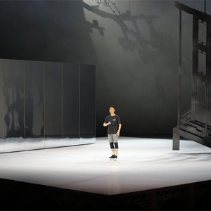 现代简洁的舞台上,一个大大的镜面装置横在舞台一侧,张军扮演的柳梦梅缓步上台,镜中人和台上人互为相映,虚实难分。另一侧,“断井颓垣”和亭台楼阁缓缓落下,舞台留白处,是若隐若现的梅枝柳影。镜中的亭台楼阁景片背面所映照,显现出有如明绘本中那般的明丽古雅的颜色,和正面的灰色两相对照,成为一组虚实难辨的装置。单雯扮演的杜丽娘此时也飘然上台,她有她的梦,而柳梦梅也有柳梦梅的梦。整个舞美空间,也如同主创们合力完成的“盗梦空间”,梦中有梦,真幻俱存。