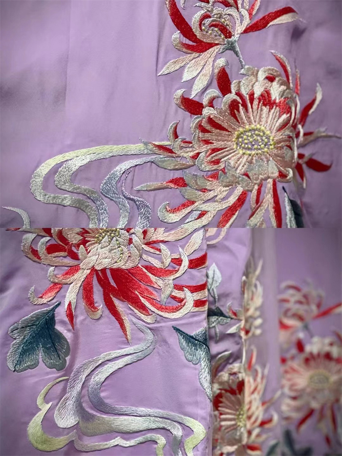 诸如柳梦梅有一套绣梅花的戏服、一套绣柳枝的戏服,暗含“不在梅边在柳边”。《回生》一折,他为杜丽娘选用了菊花作为花卉纹样,但又不希望用传统的菊花过于缟素,随后。翻到明代朱有爌编撰的《德善斋菊谱》中有一种外白内红的菊花,觉得特别契合这一折的主题,是一种有浓烈感的由死而生。而《幽媾》一折戏服上的花,颇有现代感,看似是梵高笔下常出现的鸢尾,其实却是菖蒲,正与《幽媾》有相合之处。他赖宣吾表示,我们这一次的戏服希望能够基于深厚传统,戏服形制回归经典,但在颜色和纹样上具备时代审美,不落俗套。