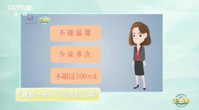 晨起的第一杯水,水温以接近人体的体温为佳,喝水量最好不超过100毫升,喝水时注意要小口慢饮,不要猛灌。