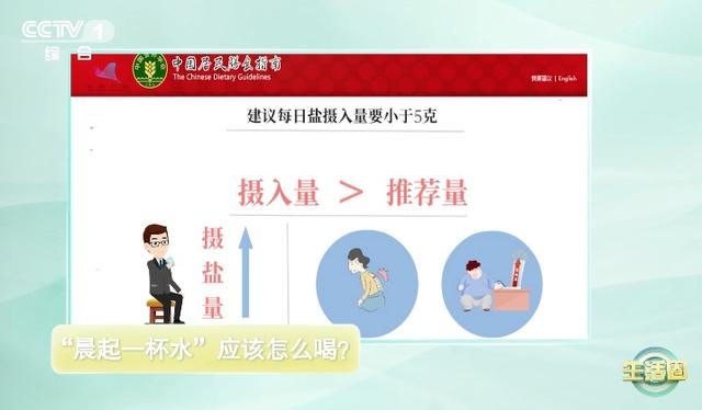 根据最新《中国居民膳食指南》推荐,每天的盐摄入量应该小于5克。而我国城乡居民每人每天的盐摄入量一般都高于推荐量。晨起如果喝淡盐水,则会增加盐摄入量,同时还增加了患骨质疏松、高血压等疾病风险。