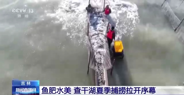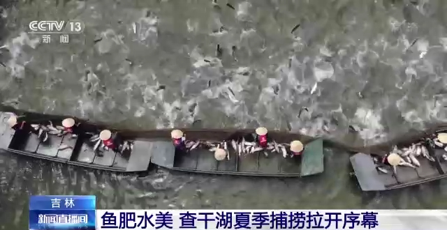 总台记者 张傲然:从8月开始,查干湖的夏季捕鱼正式拉开序幕。随着渔工们慢慢向中心靠拢进行收网,可以看到一条条活鱼腾空而起,跃出水面。当地渔工介绍,这一网就能收获十几万斤活鱼。