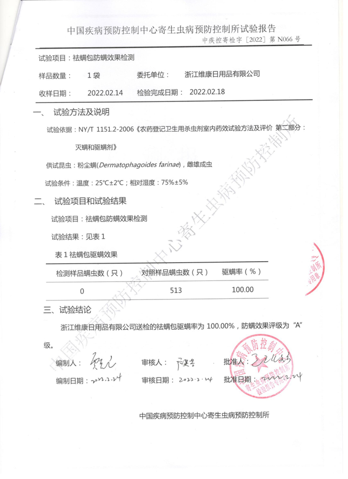 经过中疾控检测,除螨率达到99%!