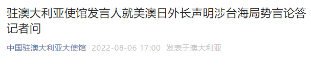 问:8月5日,美澳日外长发表联合声明,就中国在台湾岛附近海域开展军事演训活动表达关切,并对中方导弹落入所谓日本专属经济区予以谴责。请问中国驻澳使馆有何评论?