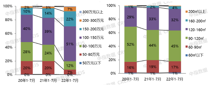 图:2020-2022年1-7月保定主城区商品住宅(不含保障房)成交总价结构及成交面积结构情况
