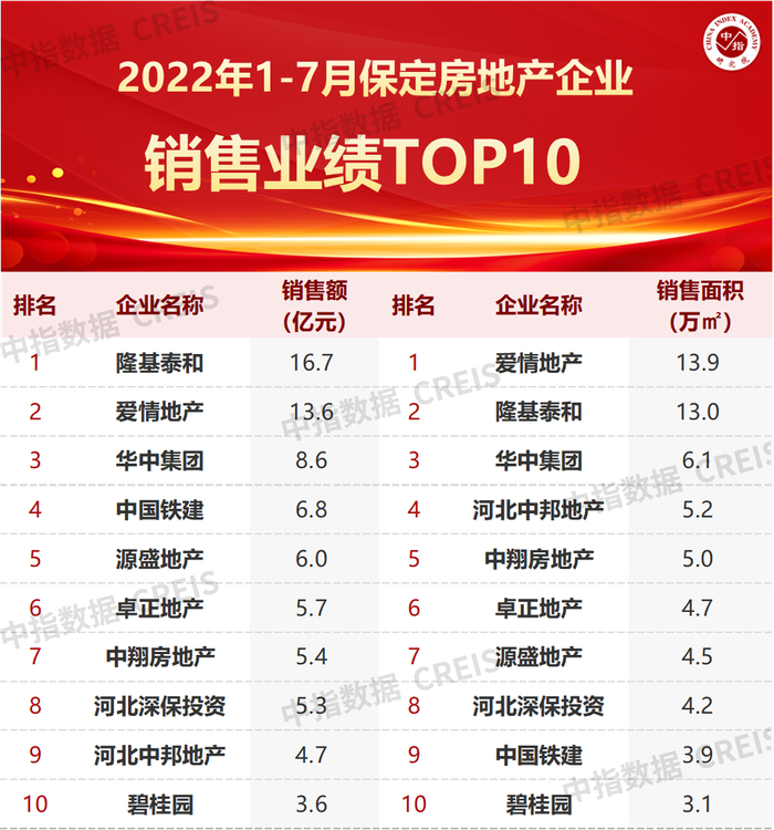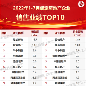 特别声明:房地产企业销售数据统计是以2022年1月1日-7月31日期间销售的商品房(包括商品住宅、写字楼、商业、公寓等)为统计口径,主要依据中指数据CREIS(点击查看)在保定市域范围(统计范围:莲池区、竞秀区、满城区、清苑区、徐水区)的销售备案数据项目,并参考当期总体经营情况和推盘去化情况进行分析统计;对于少数没有在监测范围内的企业和项目,由企业提供相关文件,经审核,也纳入统计范围。本报告仅供参考,不对使用报告及其内容所引发的任何直接或间接损失承担责任。