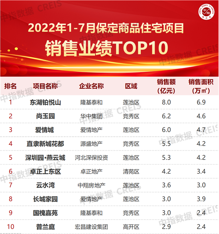 特别声明:各房企项目销售数据统计是以2022年1月1日-7月31日期间销售的商品住宅和别墅为统计口径,主要依据中指数据CREIS(点击查看)在保定市域范围(统计范围:莲池区、竞秀区、满城区、清苑区、徐水区)的销售备案数据项目,并参考当期总体经营情况和推盘去化情况进行分析统计;对于少数没有在监测范围内的企业和项目,由企业提供相关文件,经审核,也纳入统计范围。本报告仅供参考,不对使用报告及其内容所引发的任何直接或间接损失承担责任。