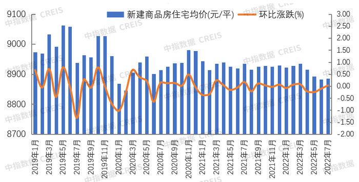 图:2019年-2022年7月保定新建商品住宅销售均价及环比走势