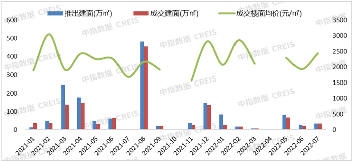 图:2021-2022年1-7月保定(主城区)住宅用地供应成交情况及价格走势
