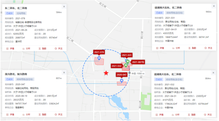 使用CREIS中指数据产品可方便快捷查询地块周边情况。拓尚房地产竞得的创新街东、莲兴路北地块位于保定东北方向上,在二环路至三环路之间,周边成交住宅地块较多,周边1.0km内成交4宗宅地(含综合用地),周边地块成交楼面价主要集中在2300-3000元/m²之间,拓尚房地产竞得地块成交楼面价2984元/m²,地价优势不大;周边3KM内有2个竞品项目在售,价格12000-17000元/m²左右,房价9000元/m²以上,利润空间较大。