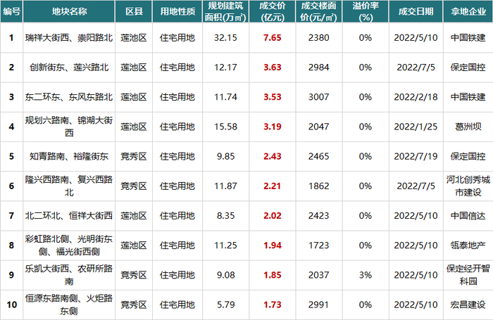 表:2022年1-7月保定主城区宅地成交金额TOP10