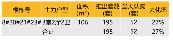 认购去化:2022年7月9日本项目开盘,推出4栋精装小高层8、20、21、23#,建筑面积105-106㎡,合计195套房源,开盘认购52套,去化率约27%。